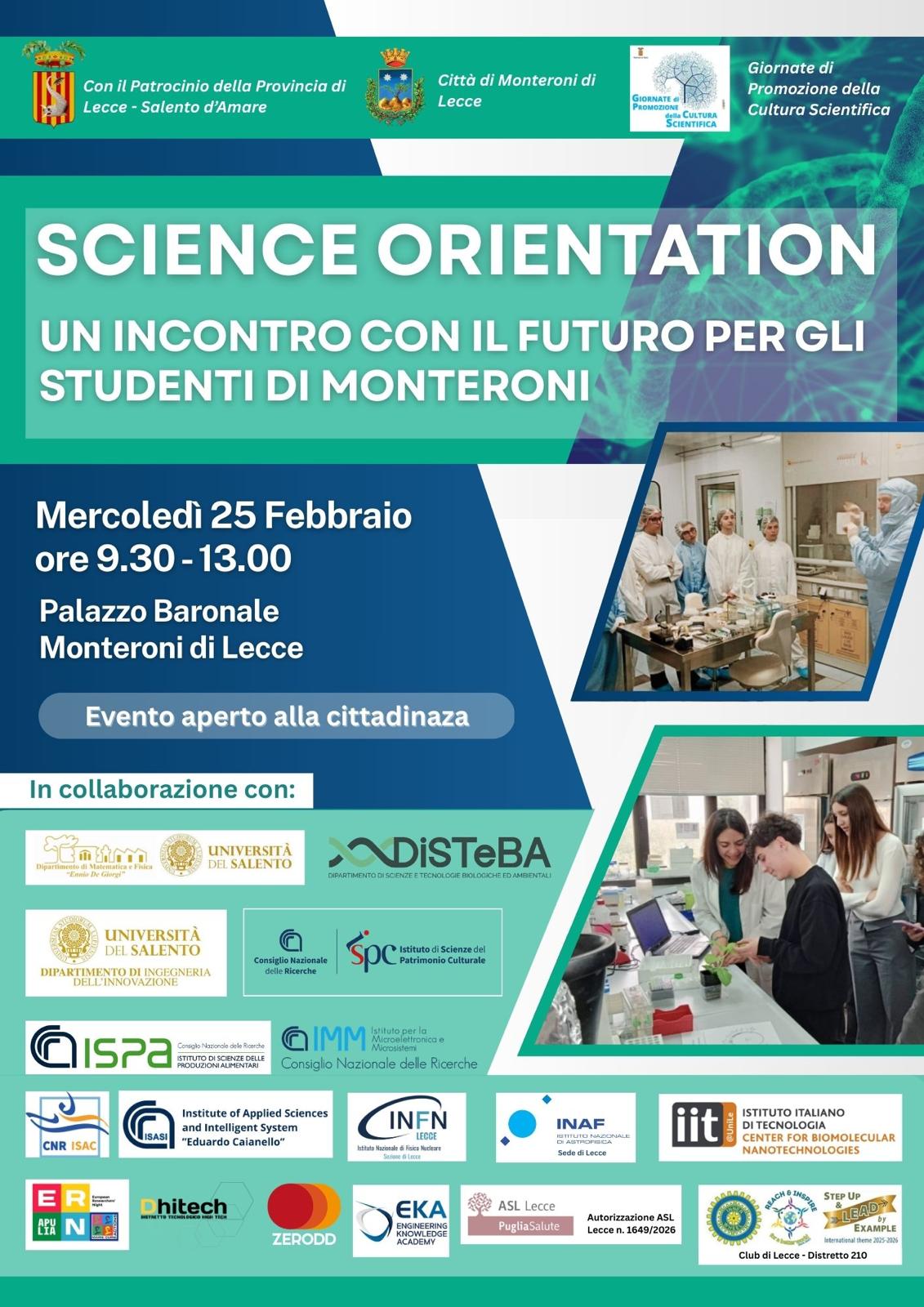 Mercoledì 25 febbraio, dalle 9 alle 13 al palazzo baronale, SCIENCE ORIENTATION: Un incontro con il futuro per gli studenti di Monteroni di Lecce.